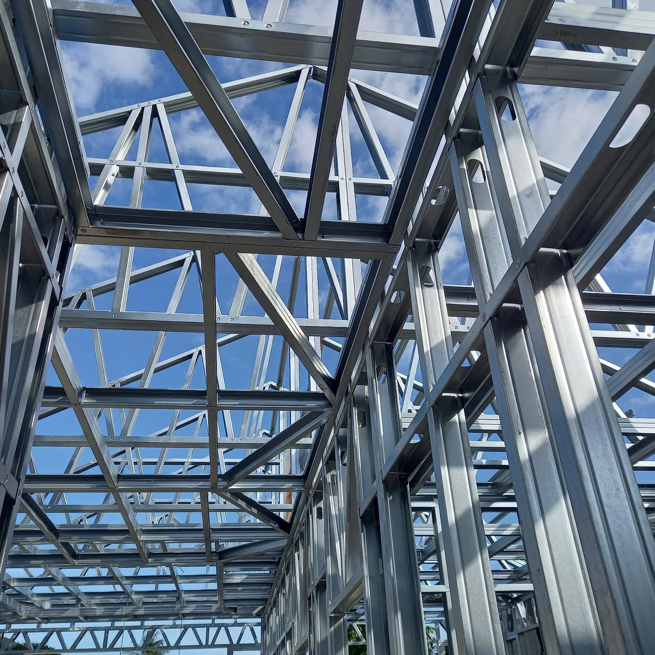 Vai trò: Là bộ khung chịu lực chính (Skeleton) của căn nhà. Khung xương được tính toán bằng phần mềm chuyên dụng để đảm bảo khả năng chịu tải trọng bản thân và các hoạt tải như gió, động đất. Liên kết hoàn toàn bằng vít cơ khí, loại bỏ các mối hàn dễ bị gỉ sét.